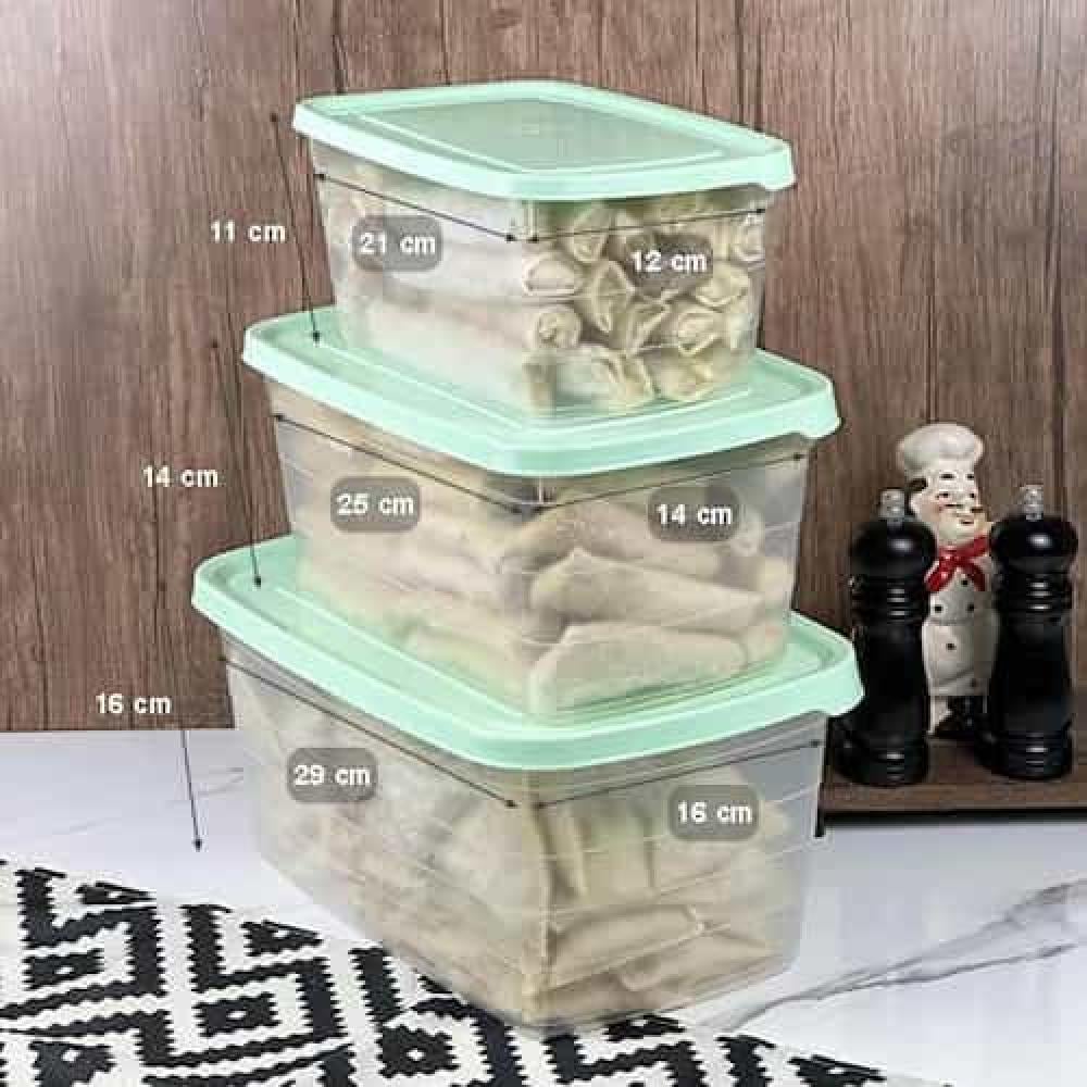 حافظات طعام بلاستيك بغطاء، تأتي بثلاثة أحجام مختلفة مما يسهل تنظيم وتخزين العناصر الغذائية المجمدة مثل المعجنات والخضروات أو حفظ بقايا الطعام بطريقة فعّالة. يتميز الغطاء بتصميم محكم الإغلاق، حيث يحافظ على النضارة ويمنع التسريب والروائح الغير مرغوبة، تساعد الحافظات على تنظيم الثلاجة وترتيب مساحات التخزين، أيضاً تساهم في تنظيم تخزين المواد الغذائية الجافة مثل الحبوب والبقوليات.