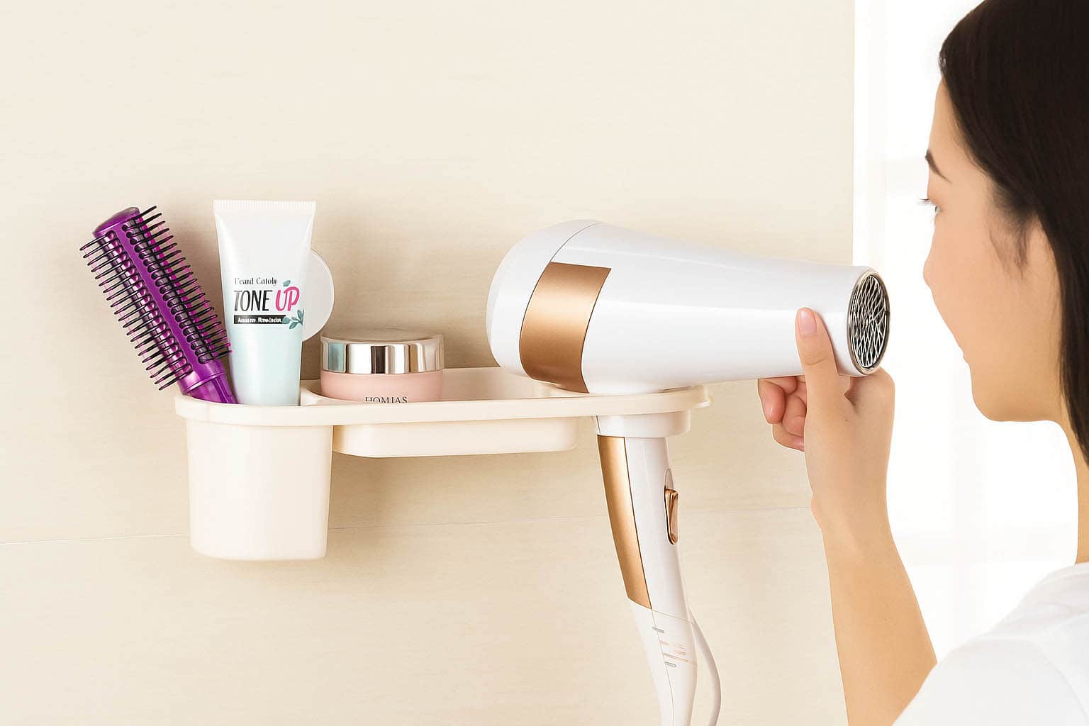 حامل استشوار ومجفف الشعر وملحقات العناية الشخصية من الضروريات التي يجب توفرها بالمنزل ، منتج عملي ومريح يهدف إلى تسهيل تخزين واستخدام مجفف الشعر وأدوات التصفيف بشكل أكثر تنظيماً حيث يعمل على تنظيم أدوات العناية بالشعر مثل الاستشوارات ومجففات الشعر وملحقاتها مثل زيوت وكريمات العناية اللازمة لتصفيف الشعر بالإضافة الى أدوات مسك ولف الشعر، كما أنهسهل التركيب والتثبيت بواسطة لاصق قوي ،