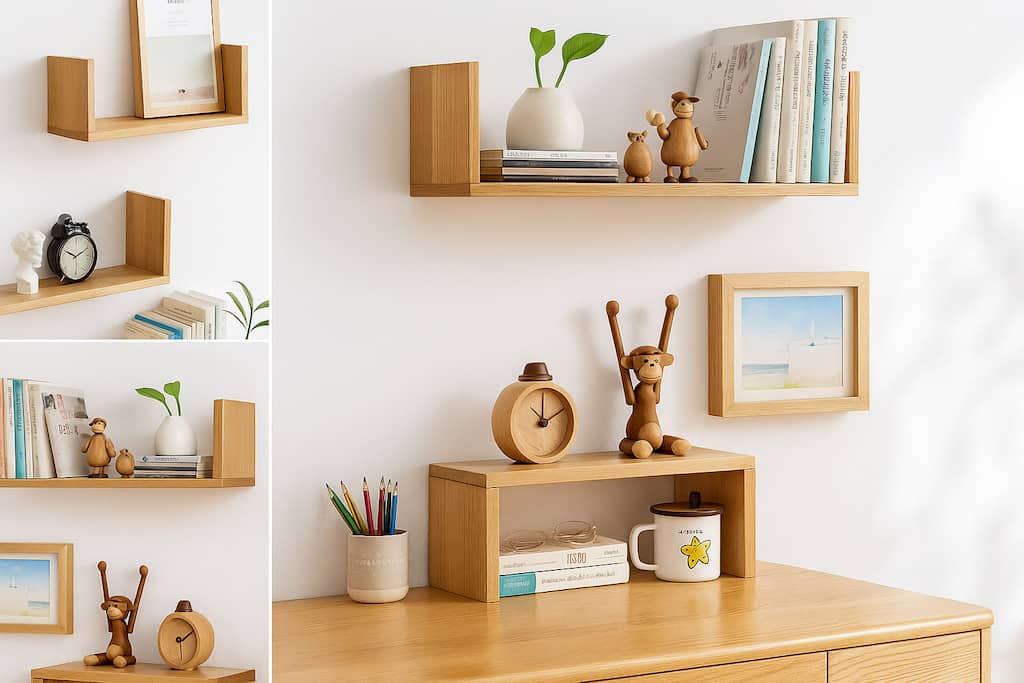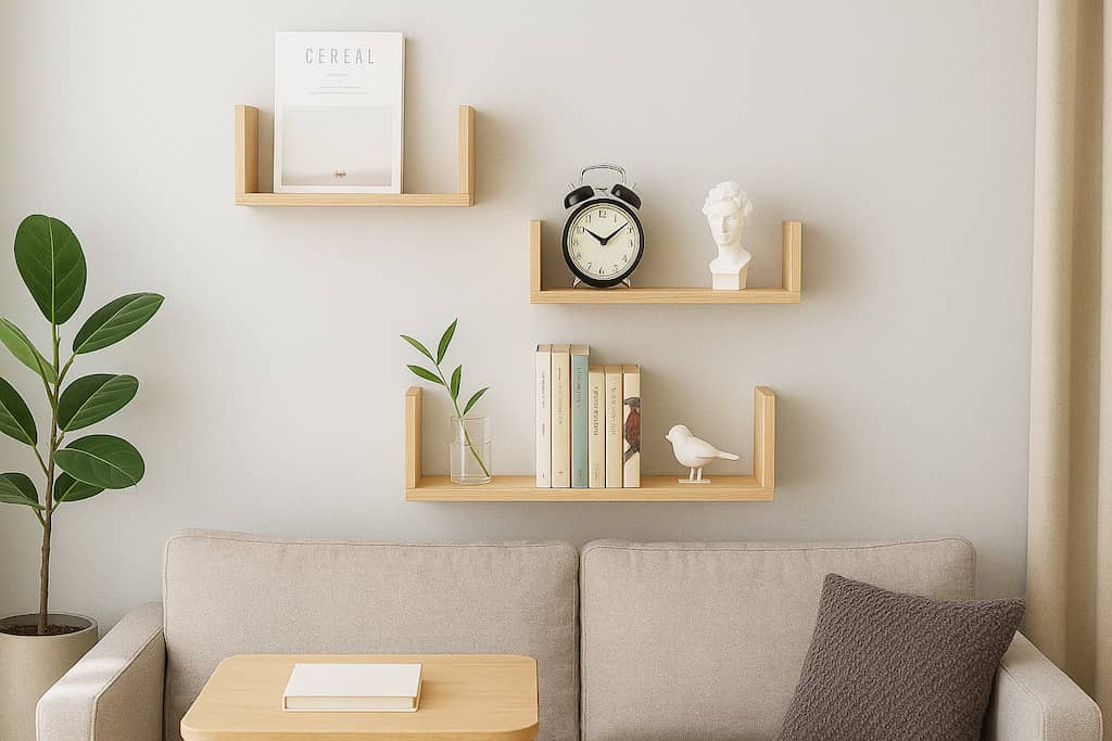 - رفوف جدارية خشبية مثالية لعرض الديكورات مثل التماثيل واللوحات الصغيرة.