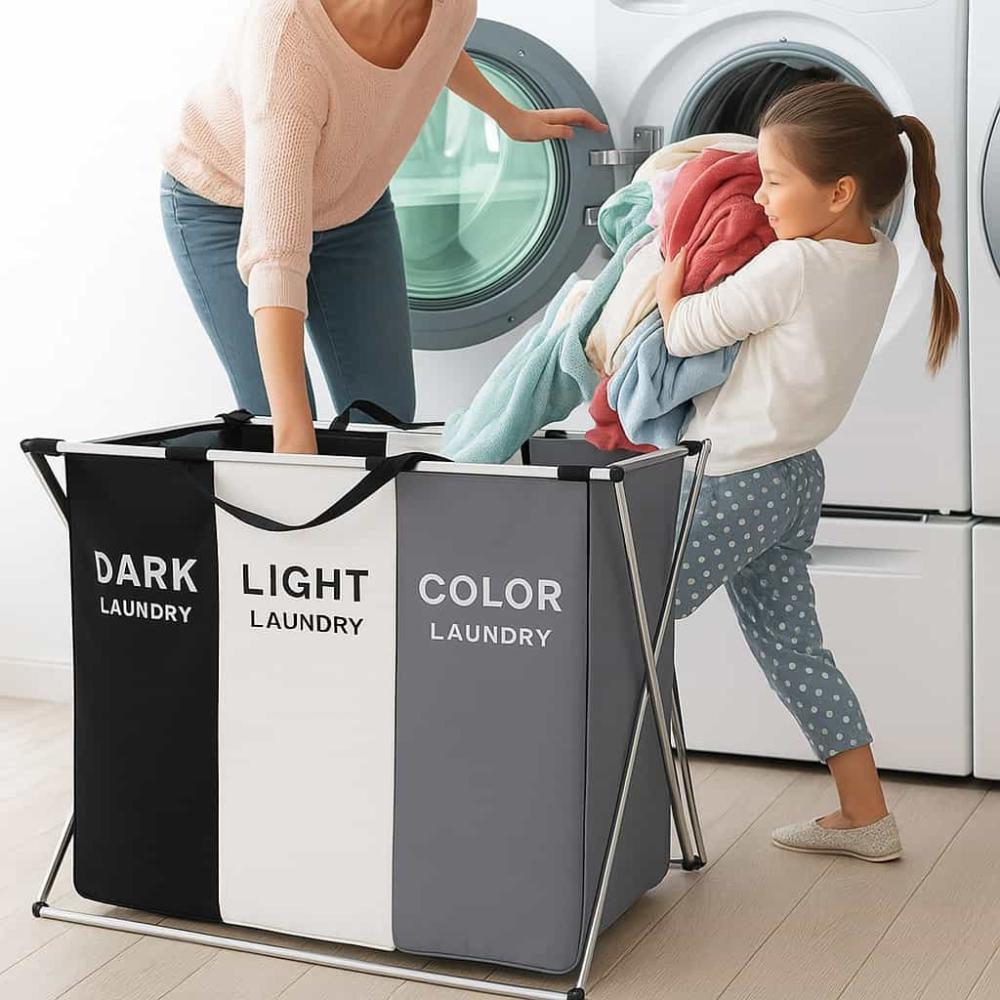 • يمكن استخدام السلة المقسمة الى خانتين أو ثلاث لفصل أنواع معينة من الملابس، مما يسهل عملية الغسيل والفرز لاحقًا.