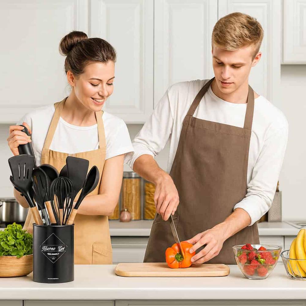 - طقم 12 قطعه: 11 ملعقة طبخ + وعاء حامل منسق