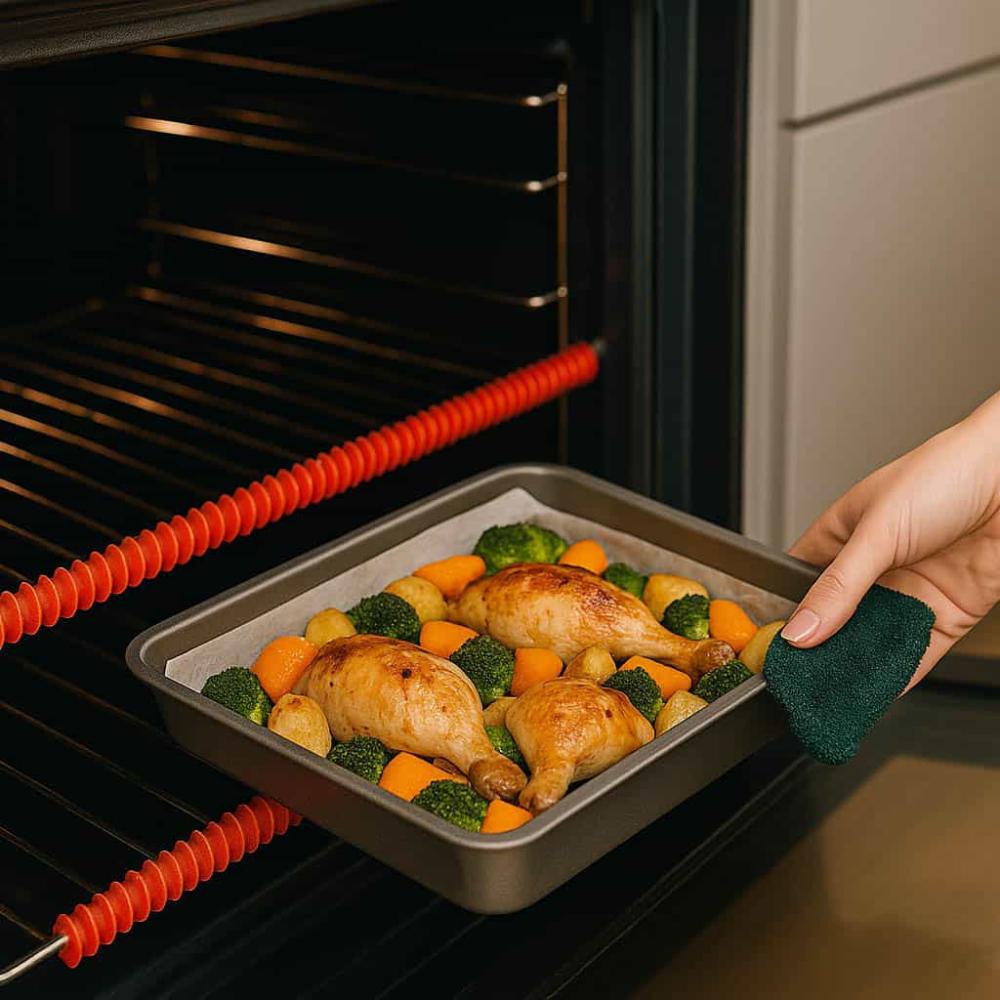 - يعتبر الغطاء واقا فعالا ليديك حيث يمنع اللمس المباشر لشبك الفرن ويحمي من حطر الحروق.