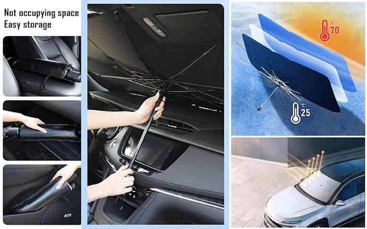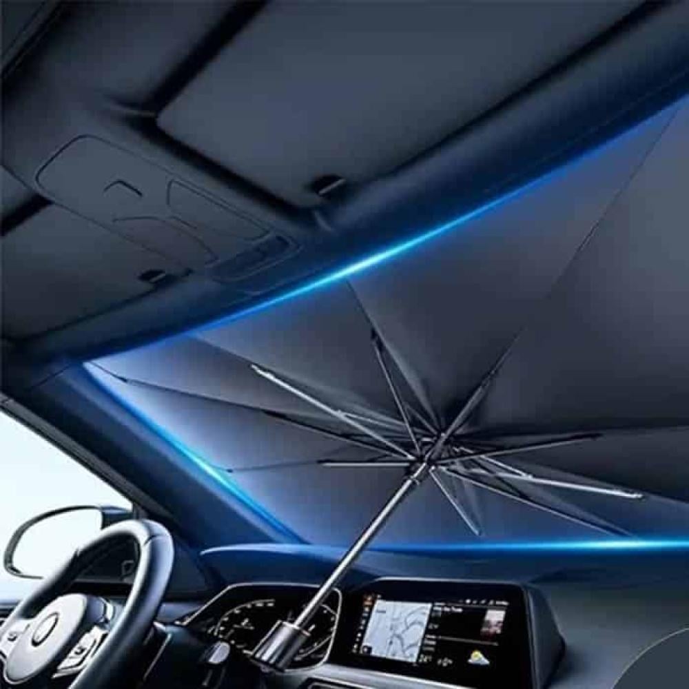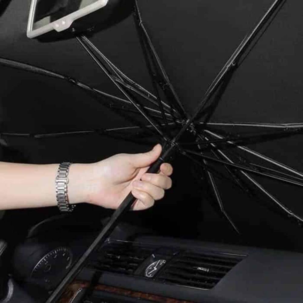 - قم بفتح المظلة وضعها بشكل مناسب على الزجاج الأمامي للسيارة