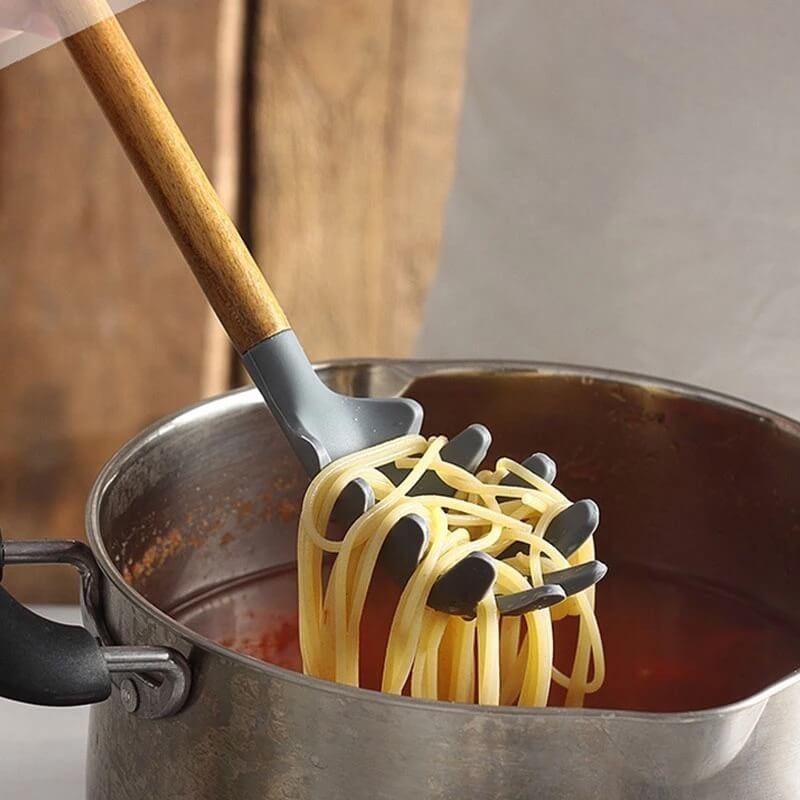 - ملعقة معكرونة سيليكون تستخدم لرفع المعكرونة من الماء المغلي بسهولة دون الحاجة إلى مصفاة إضافية.