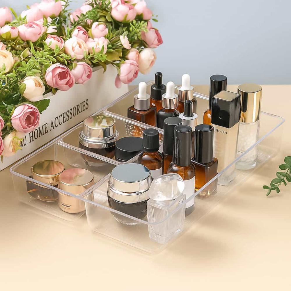 منظم متعدد الاستخدامات مصمم بشكل أنيق ، مصنوعة من الأكريليك الشفاف عالي الجودة. مقسمة إلى 4 أقسام مثالية لاحتواء مجموعة متنوعة من الأدوات أو الأغراض الصغيرة. توفر لك تصميمًا عصريًا ومتينًا، مع رؤية واضحة لمحتوياتها، مما يجعلها مثالية لاستخدامها في المنزل أو المكتب.